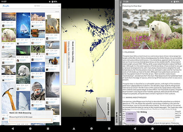 テストは、画面上に普段、スマートフォンで表示させるような内容を延々と繰り返し表示し続けてテストします。テキスト表示や写真ファイルの編集、動画ファイルの編集画面などが表示されて、バッテリーが80%→20%になるまでの時間を計測して、こうした常時使用でどれくらいの時間使えるのかを割り出してくれます。