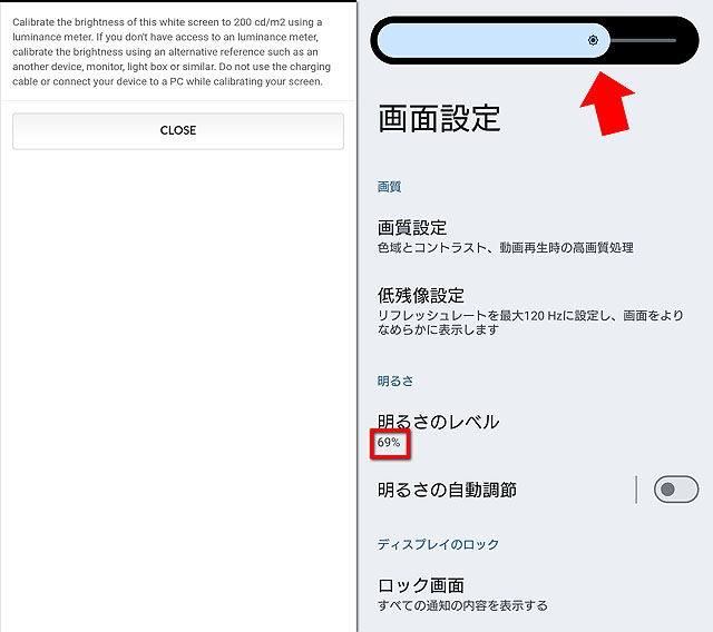 ものすごく細かい話になるんですが、このキャリブレーション画面を出してはGPSアプリで明るさを計測して200±2luxを目指して調整するんですけど、Xperiaの画面の明るさ設定ってバー操作しかできないんです。明るさ調整バーを少しずらしては計測してというのを繰り返すのですが、なかなか、それが合わなくて今まですごい苦労していたんです。