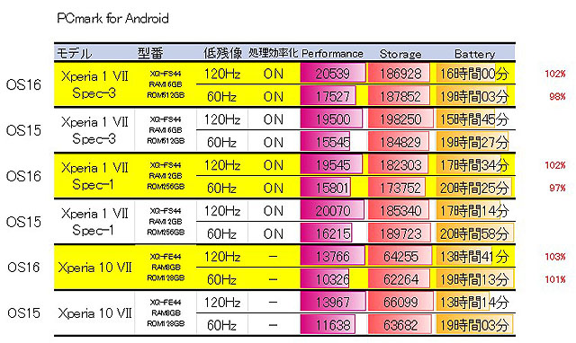 Xperia 10 VIIと、Xperia 1 VIIのRAM 12GB/ROM 256GBモデル、Xperia 1 VIIのRAM 16GB/ROM 512GBモデルの3台を用意できるので、これら3台をAndroid OS 15の状態(発売時)でテストし、その後、Android OS 16にアップグレードしてから同じテストをしています。