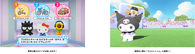 このコンテンツでは、サンリオのハローキティやクロミ、バッドばつ丸が登場するかわいく親しみやすい世界観の中で、クイズや隠れている「ジャビットくん」探しを楽しみながら、野球のルールやプレーの面白さに自然に触れることができ、子どもから大人まで家族や友人みんなで共有できる新しい映像体験を実現します。