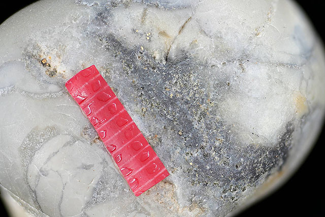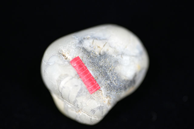 お店の方が金のあるところに赤テープでマークをしてくれているんですが、こうしてマクロレンズで撮影すると肉眼で見えていたよりもたくさんの金が見つけられます。
