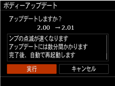 [ファイル転送完了]のメッセージが出たら[閉じる]を選び、カメラに[アップデートしますか?]のメッセージが出たら、コントロールホイールの下を押して注意事項を最後まで読み、[実行]を選択します。アップデートは約6分かかります。