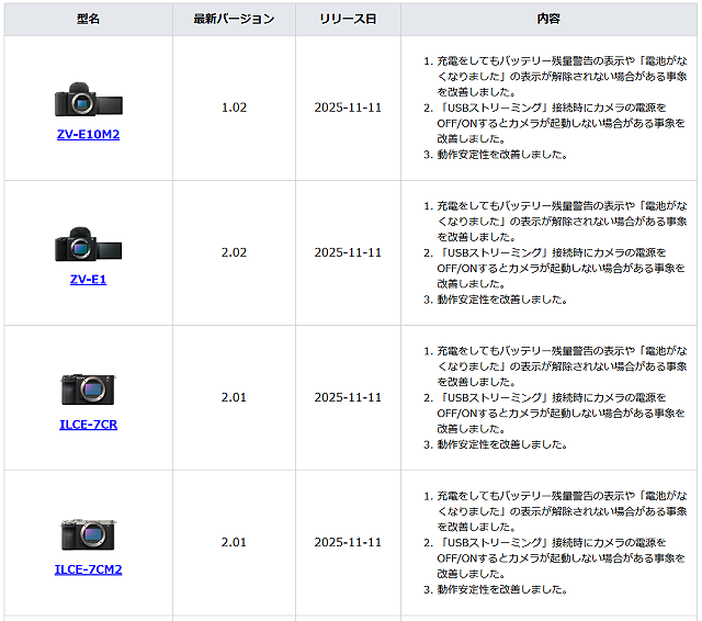 デジタル一眼カメラ「α7CR」「α7C II」とVLOGCAM「ZV-E1」「ZV-E10M2」の本体ソフトウェアアップデートがそれぞれ配信開始になりました。