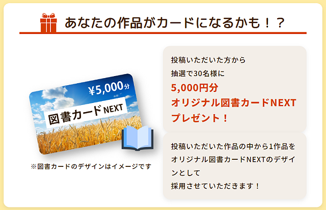 賞品として投稿した方から抽選で30名様に5,000円分オリジナル図書カードNEXTがプレゼントされるほか、投稿された作品の中から1作品がオリジナル図書カードNEXTのデザインとして採用されるとのこと。