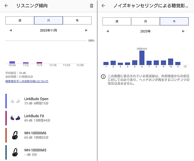 さらに「リスニング傾向」として、使っているソニーのヘッドホンの機種ごとに鳴らしている平均の音圧と、使用時間がログとして記録されていて、これで週間、月間、年間のヘッドホンの使用量までわかる仕組みになっています。