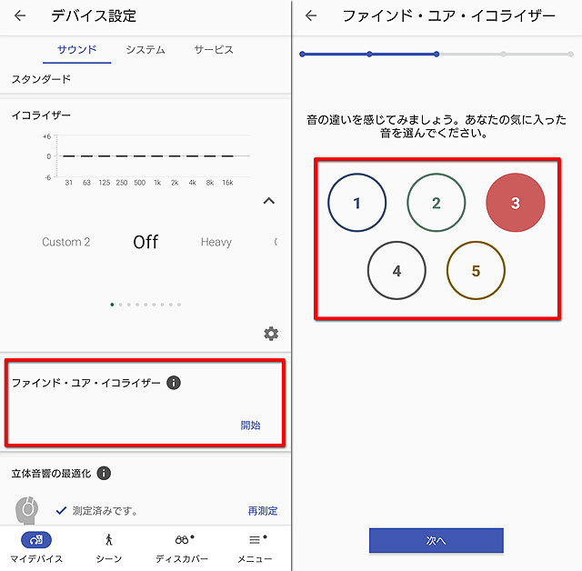 開始すると5つの番号が振られた、すこしずつ音質の違う設定があるので、これを自分の好きな楽曲を再生しながら選んでいきます。2回選択すると、その中から理想的な調整をしたイコライザーが見つかる、というわけです。
