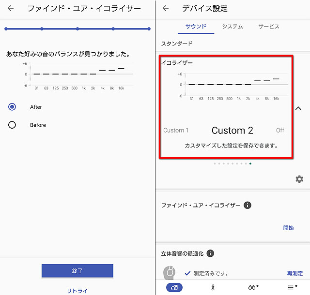 調整した音質はイコライザーの「Custom 2」に記録してくれるので、これでしばらく使ってみると良いんでしょうね。また、調整してみたくなったら同様に音を選んでいくと違うイコライザーカーブが見られるかもしれません。