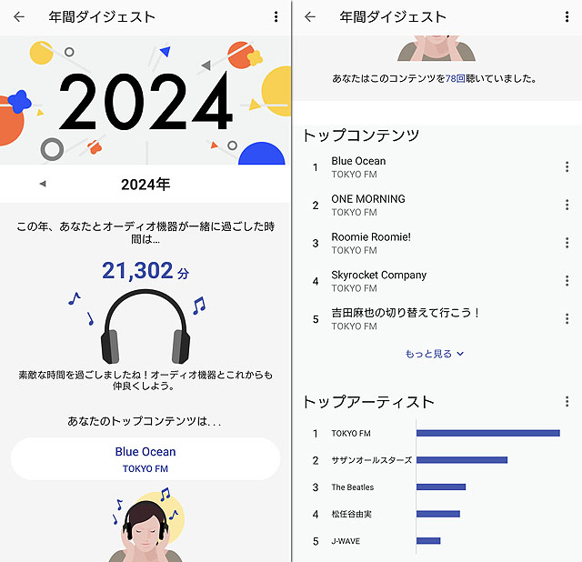 そして1年が経つと年間ダイジェストもリストアップしてくれます。私は昨年の2024年は21,302分、ヘッドホンを使っていたそうです。355時間、14.8日もソニーヘッドホンと過ごしていたんですって。