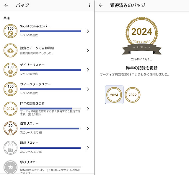 そして中でも気にしているのが「昨年の記録を更新」というもので、これは延べ何日、Sound Connectアプリにソニーヘッドホンを接続したのかがバッジになっています。これをみると2023年は記録を更新できなかったようです。