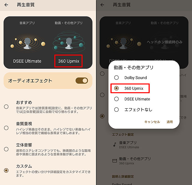 「360 Reality Audio Upmix」自体は、Xperia 1シリーズにひっそりと搭載されています。デフォルトだと動画再生時には“Dolby Sound(ドルビーサウンド)”が動作します。なにもしないとそのまま使いがちですが、Xperia 1 VIIではカスタムで動作再生時に「360 Upmix」が選択可能。