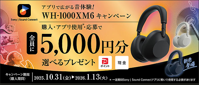 10月31日から2026年1月13日まで「WH-1000XM6」の5,000円分のプレゼントがもらえるキャンペーンが開催されています。