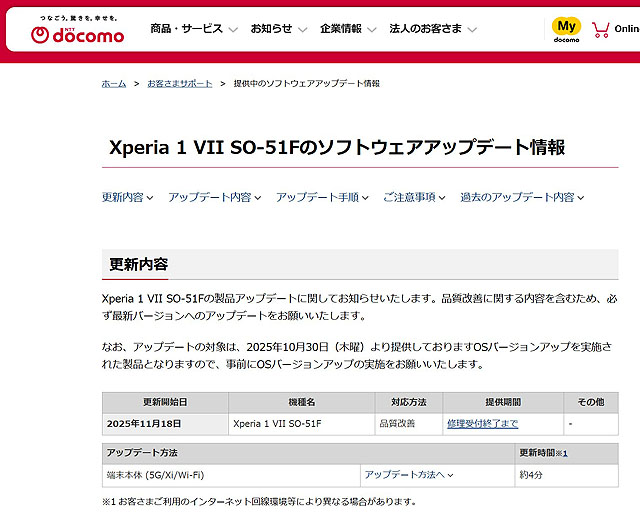 ドコモで販売しているキャリアモデル「Xperia 1 VII SO-51F」について製品アップデートの案内があり「Android16へOSバージョンアップすると一部の充電器で充電ができない場合がある事象」について改善されるとのことです。