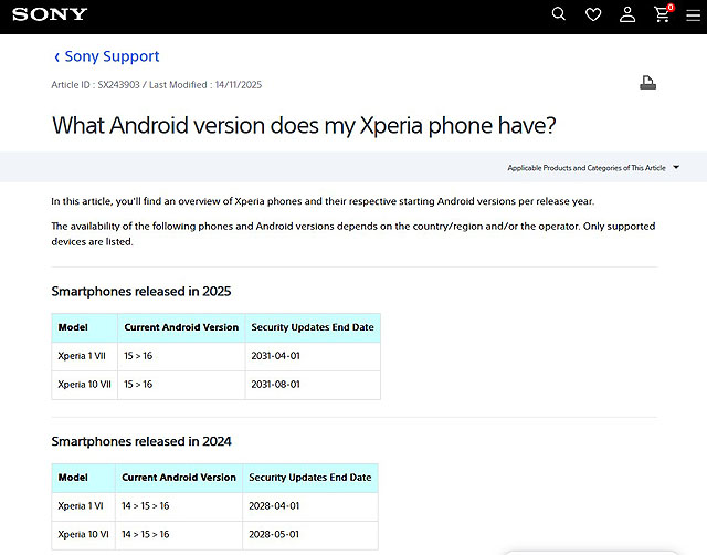 先日までXperia 10 VIIについての情報掲載がなかったのですが、それも数日前に掲載があったようです。最新モデルのXperia 1 VIIは2031年4月まで、Xperia 10 VIIは2031年8月までサポートされるとなっています。