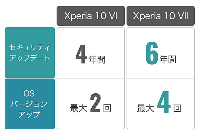 まずは「Xperia 1 VII」からですが、こちらはOSアップグレードが3回→4回になっています。セキュリティアップデートも4年間→6年間になっています。