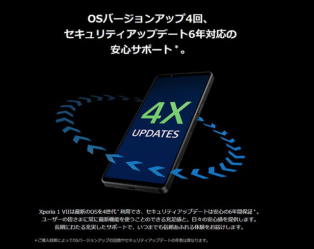 Xperia 1 VIIが発売になった際にも同様の記事でご案内をしたことがありますが、4回のOSアップグレードと6年のセキュリティアップデートの保証がある2025年モデルの「Xperia」は長期的な目で見るとかなりお買い得なモデルになっています。