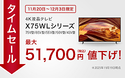 ソニーストアにて4Kブラビア「X75WLシリーズ」のタイムセールが11月20日(木) ~ 12月3日(水)までの期間限定でスタートしました。