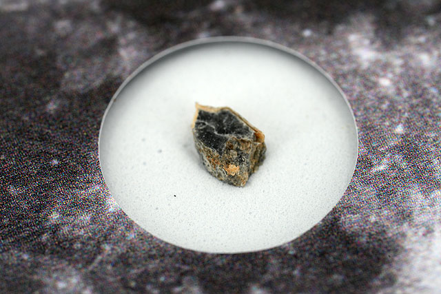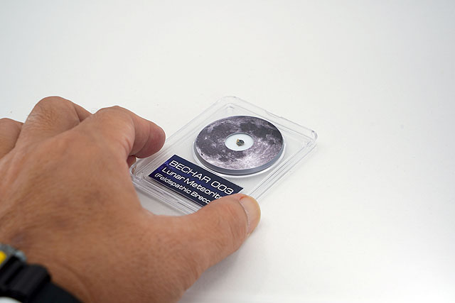 まず最初の↑こちらは90mmマクロレンズによる「1倍」での撮影です。価格は1万円近くする月隕石ですが、その大きさは5mmもないほどの豆粒以下の欠片なんです。