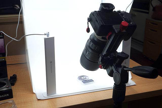 この日のために、LED照明付きのポータブルスタジオ撮影ボックスや、撮影距離を微調整できるマクロスライダーなどを準備しておきました。店頭で100mmマクロの性能を存分に楽しめるようセッティングしています。
