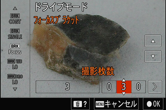 「フォーカスブラケット」というのはカメラにフォーカス位置を少しずつ変えて連続撮影してもらうモードです。露出ブラケットやWBブラケットなどがありますが「フォーカスブラケット」はこうした小物撮影をするときに利用する機能です。
