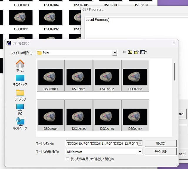 ウインドウが開くので、ここで合成したい画像ファイルを一度に選択して「開く」ボタンを押します。