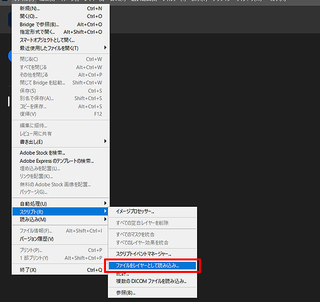 フォトショップの場合は「ファイル」>「スクリプト」>「ファイルをレイヤーとして読み込み」で、撮影した画像をすべて選択して1枚の画像ファイルにレイヤーとして重ねて開きます。