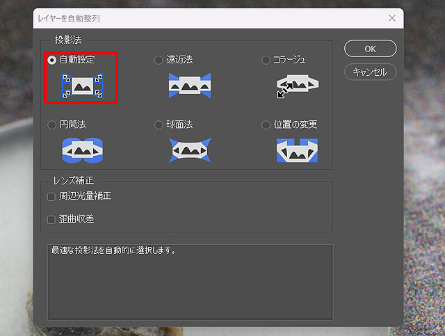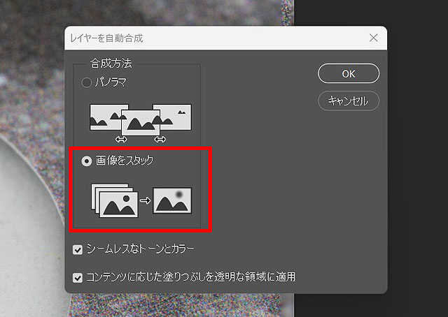 レイヤーを自動合成では「画像をスタック」を選びます。