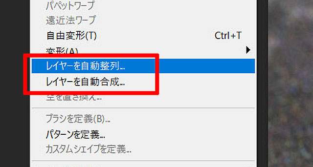 画像を取り込んだら、読み込んだレイヤーをすべて選択した状態で「編集」>「レイヤーを自動整列…」で、画像の位置調整をします。