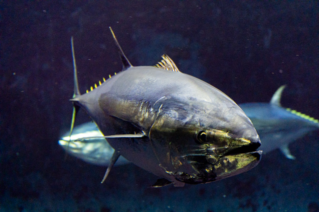 葛西臨海水族館ご自慢のマグロの回遊シーンです。このシーンは少しレアなシーン?です。見ると背びれが2枚ありますが、前の背びれはブレーキの働きをするヒレで水槽内でターンをするときにだけ、少し出していて、普通に泳いでいるときは畳まれているヒレになります。