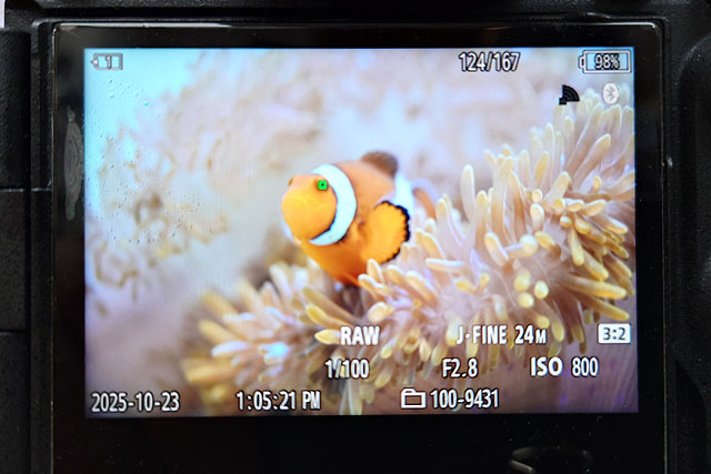 水槽での撮影ですが、水槽によって照明が違っているので撮影はRAW撮影にしておいて、あとから現像でバランスを取るのが良いようです。シャッタースピードは1/100以上のスピードで撮影できれば、ブレはほぼ取れそう。