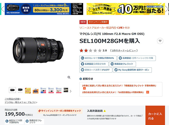「SEL100M28GM」はソニーストアの60回分割払い手数料0%の対象製品になっています。分割手数料0%なので、今、全部一度に払っても、60回分割にしても支払総額は一緒です。(キャンペーンは期間限定で2026年1月14日10時までです。)