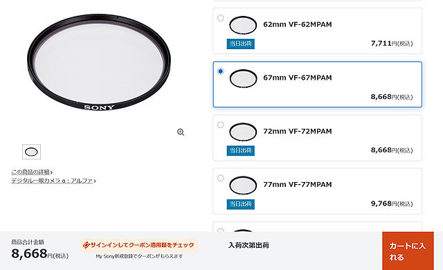 同様にこちらはSEL100M28GMに装着出来る67mm系のフィルターですが、こちらも現在、入荷次第出荷になっています。