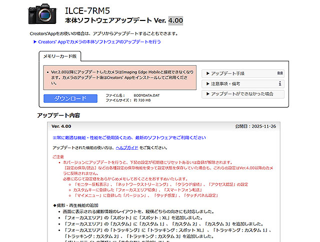 デジタル一眼カメラ「α7R V」の大幅なアップデート「Ver. 4.00」が公開になりました。