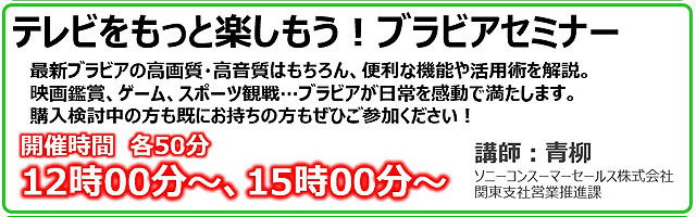 | 12時00分 | テレビをもっと楽しもう!BRAVIA セミナー by 青柳氏 |