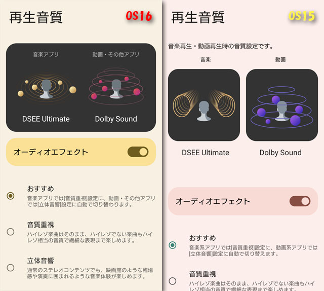 再生音質のエフェクト設定がAndroid 16になったことで、Xperia 1 VIIと同じUIになったようです。ソニー製の立体音響エフェクトである「360 Upmix」の設定がしやすくなっていますので、これは是非、試してみていただきたいところです。