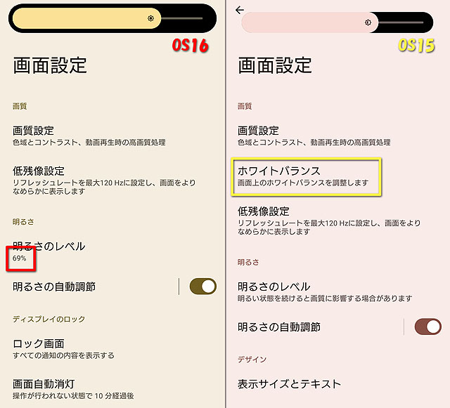あとは細かいところですが、明るさレベルのところに輝度出力が%表示されるようになったのと、ホワイトバランスが画質設定の中に移動している点などが変更点になっています。どれもXperia 1 VIIと同じ変更になります。