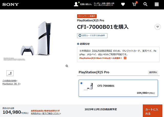 PlayStation 5 Pro (CFI-7000B01) 2025年12月15日頃出荷予定 |