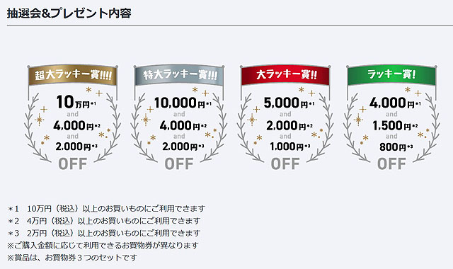 3つのお買い物券をもらうことができるんですが、10万円以上のお買い物で5,000円分、4万円以上のお買い物で2,000円分、2万円以上のお買い物で1,000円分のお買い物券を使うことができます。