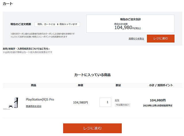 今なら買える! ということでカートに入れて決済画面に移ってみると。。。