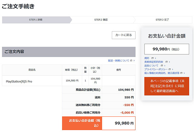 なんと、購入価格が99,980円になりました! なんと12万近くするPlayStation Proが10万円を切った価格で買えるんです。そんなに安くなるの? というか、その前に購入手続きのところにある「お買い物券ご利用分」の5,000円引きってなんでしょうね。