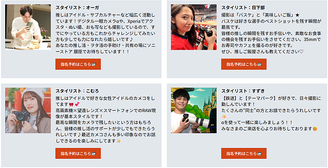 タイリストさんはジタル一眼カメラαや、Xperiaでアクスタ・ぬい撮、おも写をされていたり、バスケの好きな選手を撮影されていたり、女性アイドルを高画素機×望遠レンズ×スマートフォンで撮影されていたり、鉄道とテーマパークが好きで、日々撮影に勤しんでいたりと、多種多様。実際に推しを追いかけているからこそ聞ける撮影のヒントなども聞けそうです。