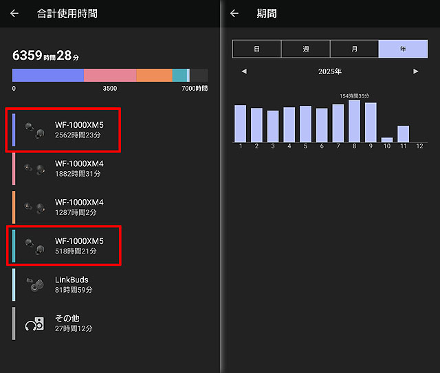 今年の6月頃に充電不具合がありWF-1000XM5を交換修理してもらっているのですが、そこから半年かからずにすでに使用ログが518時間に達しています。修理前の機体で2562時間使用しているなど、すごいです。