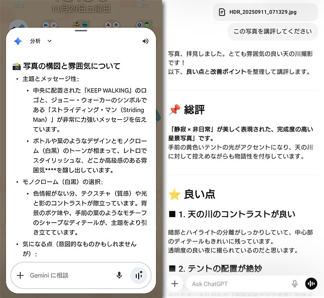 普通に「写真を講評してください」というと、基本は褒めちぎってくれて気持ち良くさせてもらえます。改善ポイントもいくつか上げてくれるので参考になります。
