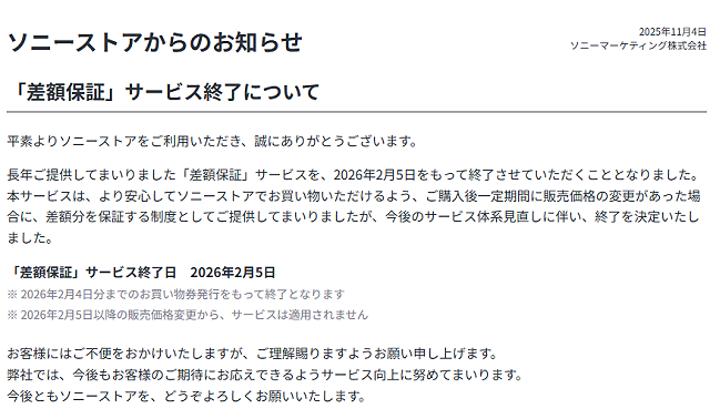 ソニーストアの「差額保証」サービスが2026年2月5日をもって終了になることが発表になりました。