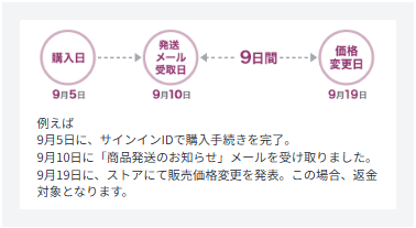 この「差額保証」というのは、価格変更が実施された日(価格変更日)から10日以内に、変更前の税抜価格と変更後の税抜価格の差額に消費税分を加えた額の「お買い物券」を返金対応として発行してもらえるというものです。