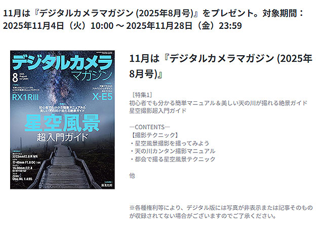 11月は『デジタルカメラマガジン (2025年6月号)』になります。My Sony IDをすでにお持ちの方だけではなく新規ID登録された方も対象です。