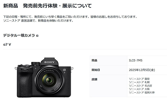 “α7 V”は金曜日の12月5日より全国のソニーストア店舗にて先行体験展示がスタートします。先行体験は予約制になっており、お一人様1回15分で予約は12月3日(水)11時から受付開始となっています。