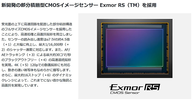 部分積層型CMOSセンサーの搭載により、センサーの読み出し速度はα7 IV比で約4.5倍。シャッタースピードも電子シャッターで最高1/16000秒に対応しています。