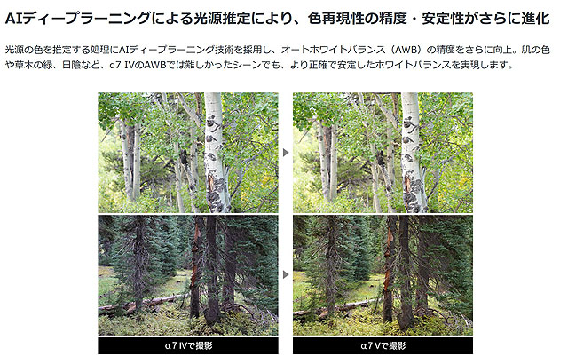 α1 IIでは赤外線センサーも使ってホワイトバランスを調整していましたが、α7 VではCMOSセンサーの入力光だけで、AIを使って光源の推測をしているですかね? 作例を見ると相当な効果がありそうです。