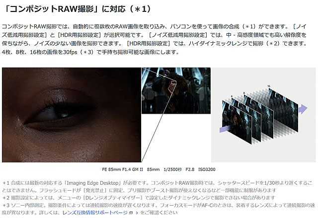 「コンポジットRAW」というのはα9 IIIやα1 IIユーザーさんにはおなじみだと思います。α7 IVユーザーさんですと聞き慣れない言葉になると思いますが、これは複数枚のRAW撮影をして、あとでPCを使ってImaging Edge Desktopにてスタック合成を行い、ノイズ低減などを行う技術です。