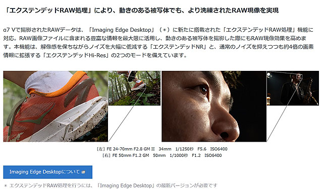 ノイズを低減する「エクステンデッドNR」と、4倍の画素情報に拡張する「エクステンデッドHi-Res」の2つのモードを用意しており、撮影時に設定してRAW撮影後、メーカー純正の現像ソフト「Imaging Edge Desktop」で処理を行います。